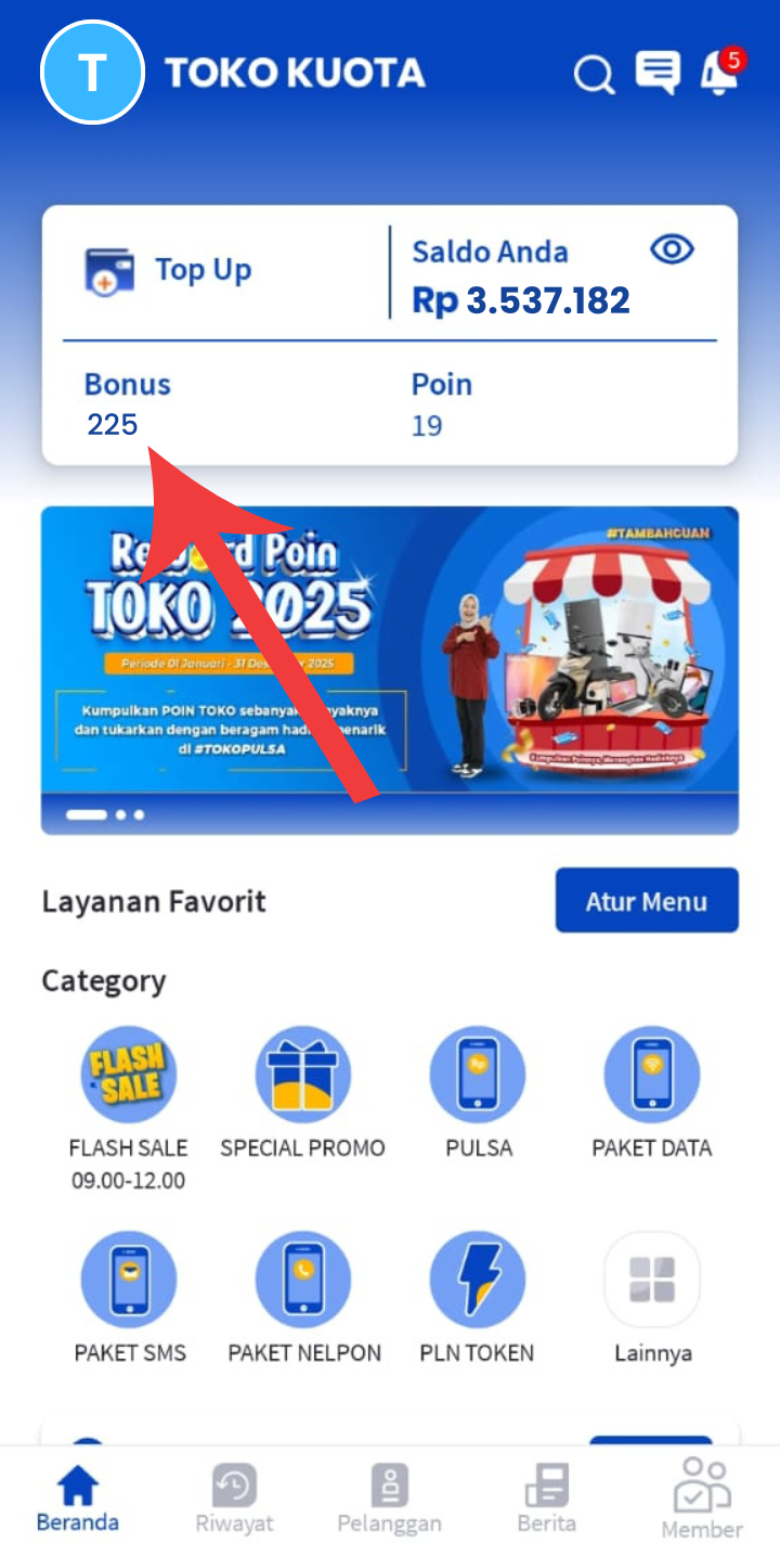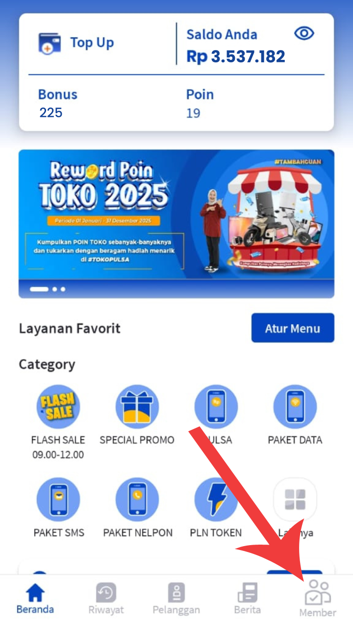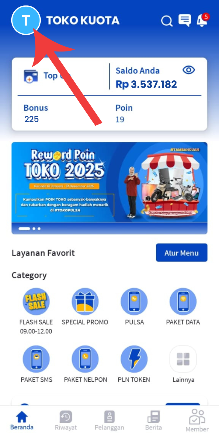 5. Buka lagi aplikasi Toko Kuota di HP istri / anak / keluarga anda. Silakan isi saldo di akun tersebut untuk isi pulsa, kuota atau token untuk kebutuhan sendiri dulu, caranya klik di sini