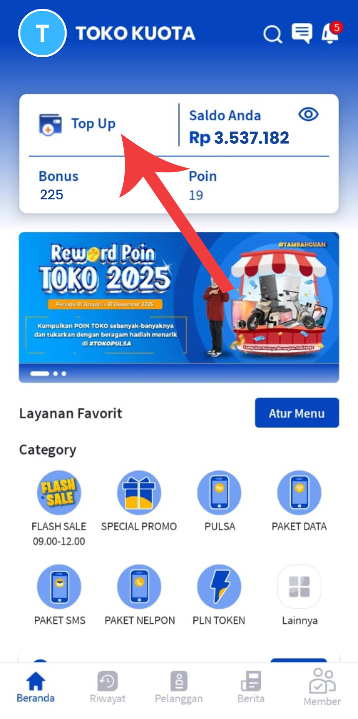 5. Buka lagi aplikasi Toko Kuota di HP istri / anak / keluarga anda. Silakan isi saldo di akun tersebut untuk isi pulsa, kuota atau token untuk kebutuhan sendiri dulu, caranya klik di sini