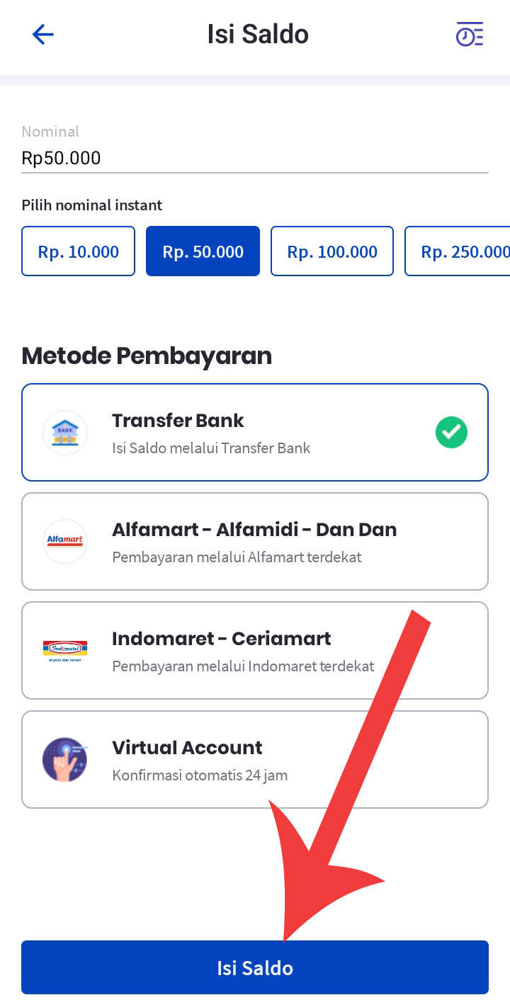 NB: Untuk isi saldo bisa lewat ATM atau Mbanking Bank BRI, BCA, Mandiri, BNI (Gratis biaya admin), bisa juga via Alfamart, Indomaret dan Virtual Account.